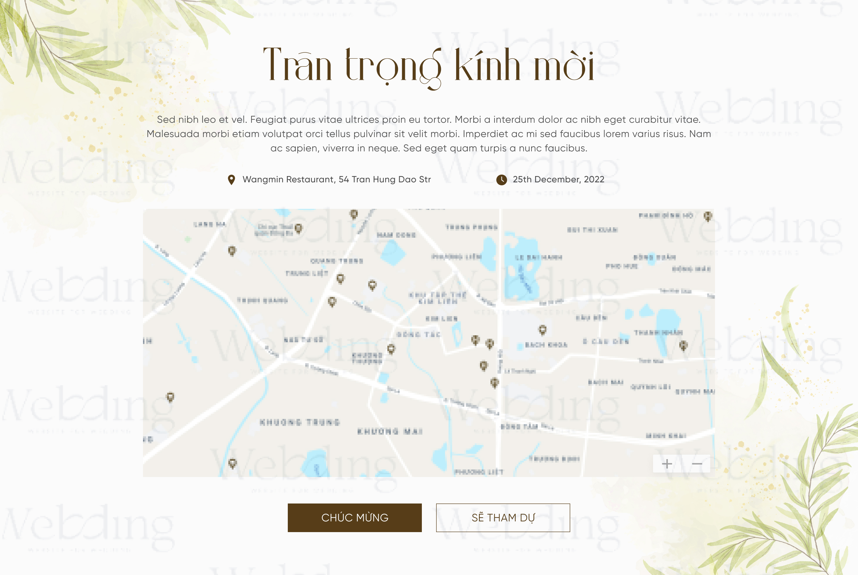 Khách hàng có thể thay đổi thiết kế theo yêu cầu dựa trên template sẵn có (không quá 30% thiết kế ban đầu). Ngoài ra khách hàng cũng có thể yêu cầu Webding tư vấn và đặt thiết kế riêng mẫu thiệp cưới hoàn toàn mới phù hợp với thẩm mỹ và yêu cầu cá nhân.